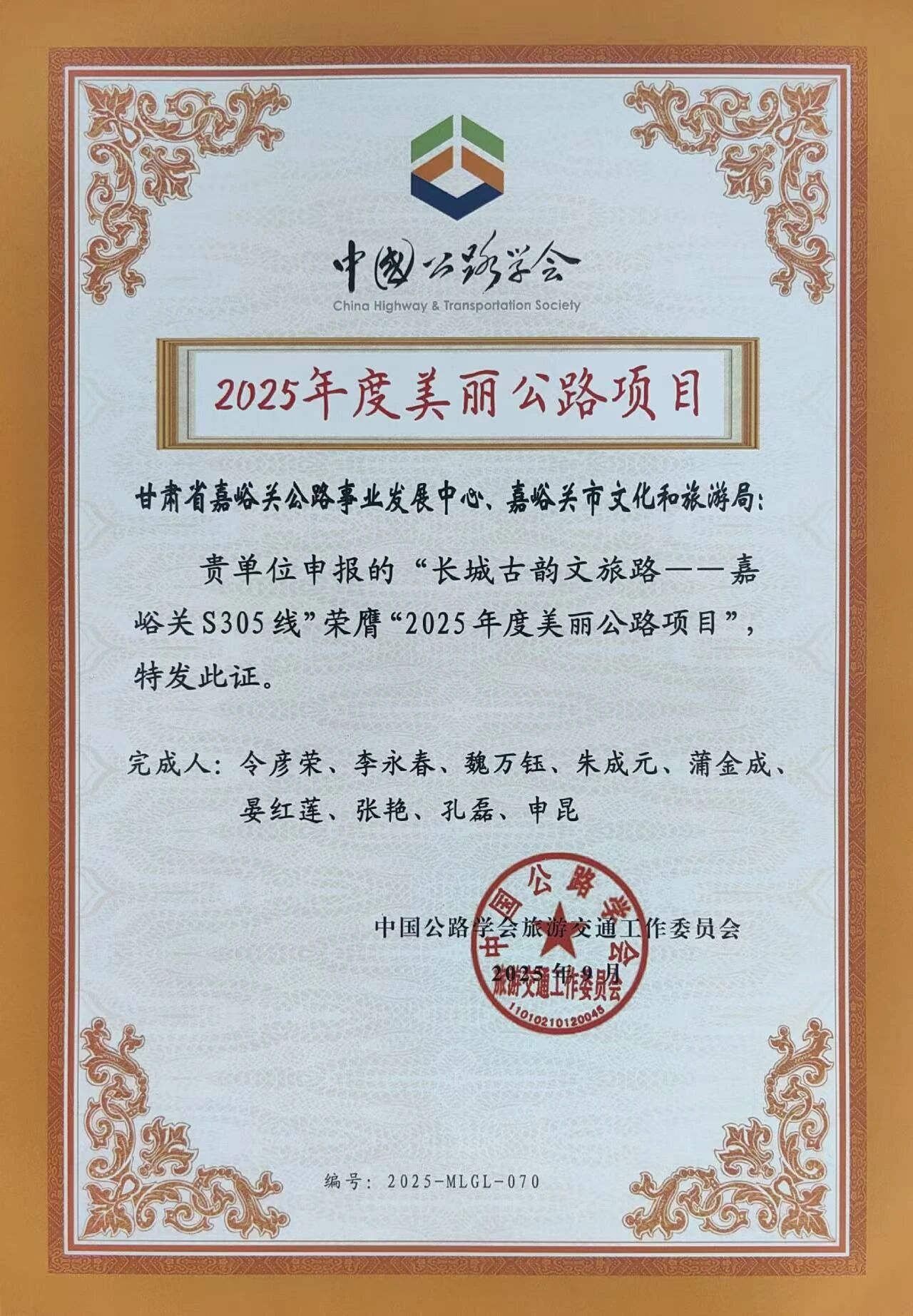 9月11日,在中國(guó)公路學(xué)會(huì)主辦的第八屆旅游交通大會(huì)上,“長(zhǎng)城古韻文旅路——嘉峪關(guān)S305線”榮獲“2025年度美麗公路項(xiàng)目”稱號(hào)。該獎(jiǎng)項(xiàng)不僅是對(duì)嘉峪關(guān)公路事業(yè)發(fā)展中心在公路養(yǎng)護(hù)創(chuàng)新理念與實(shí)踐成果方面的肯定,也標(biāo)志著其在推進(jìn)“交通+旅游” 融合發(fā)展方面探索出了符合區(qū)域特色的路徑,為進(jìn)一步激活沿線文旅資源、服務(wù)地方發(fā)展奠定了基礎(chǔ)。