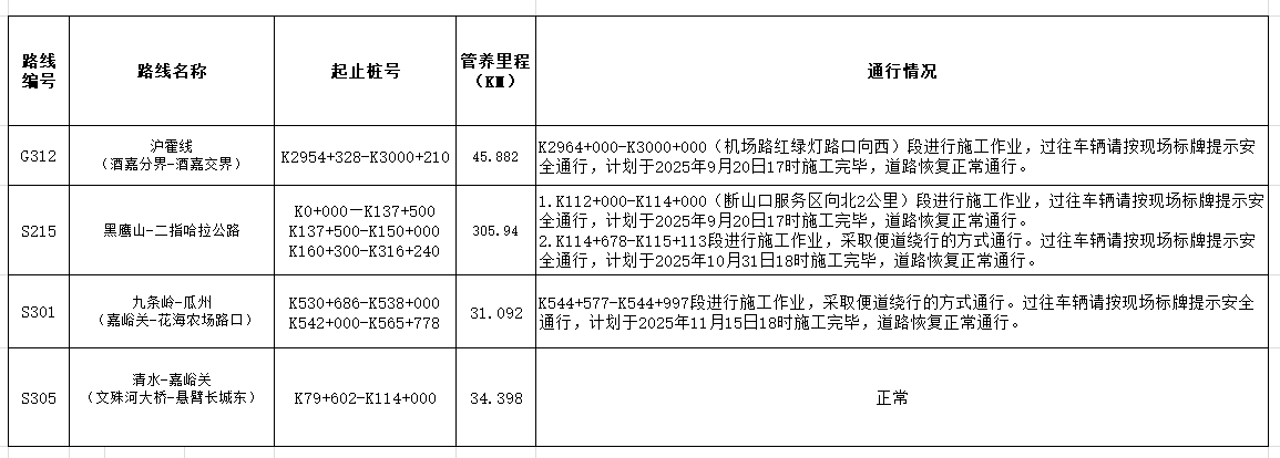 • 嘉峪關公路事業發展中心管養公路路況信息(2025年9月12日)