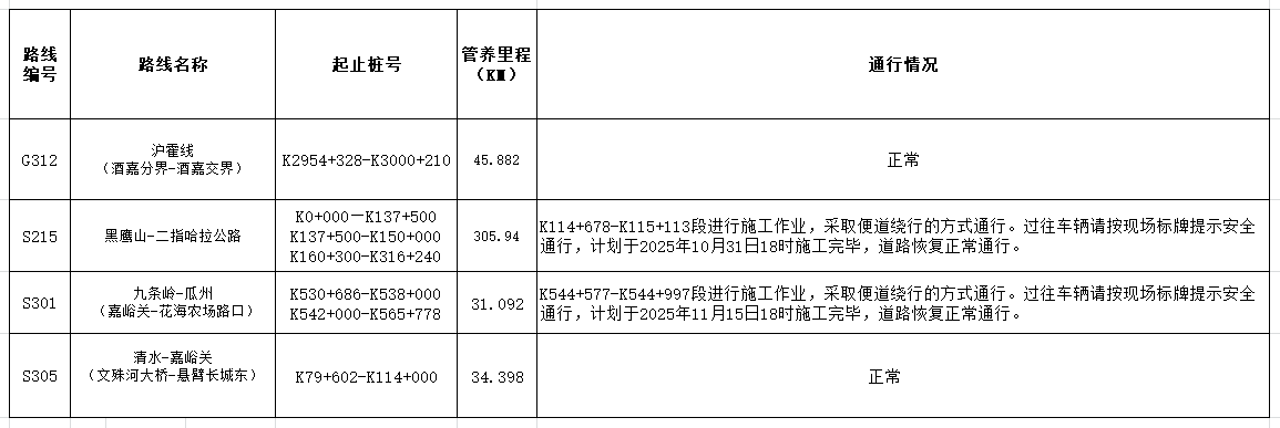 • 嘉峪關公路事業(yè)發(fā)展中心管養(yǎng)公路路況信息(2025年9月27日)