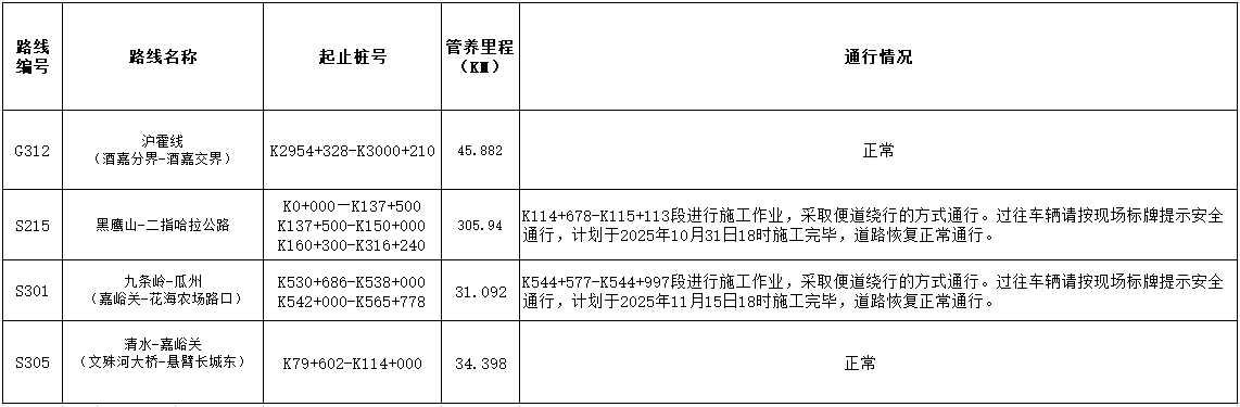 • 嘉峪關公路事業發展中心管養公路路況信息(2025年10月3日)