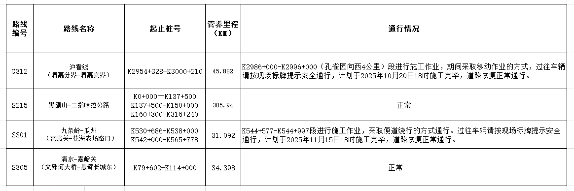 嘉峪關(guān)公路事業(yè)發(fā)展中心管養(yǎng)公路路況信息(2025年10月20日)