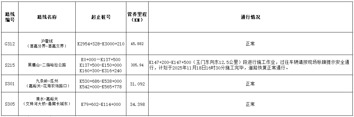 嘉峪關公路事業發展中心管養公路路況信息(2025年11月18日)