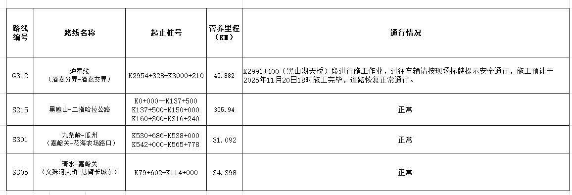 • 嘉峪關公路事業發展中心管養公路路況信息(2025年11月12日)